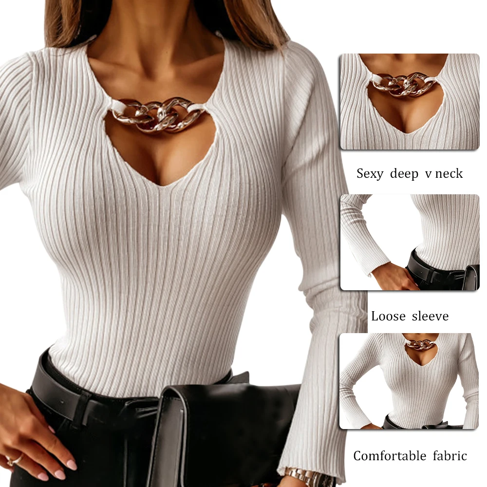2021 Fashion Spring Women Shirt Sexy V-Neck Metal Chain Hollow Female Knitted Blouse Casual Solid Slim Lady Rib Blouse