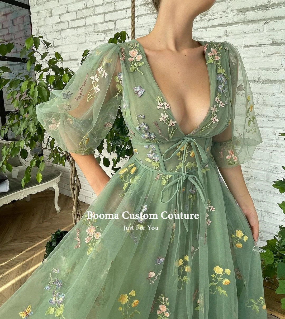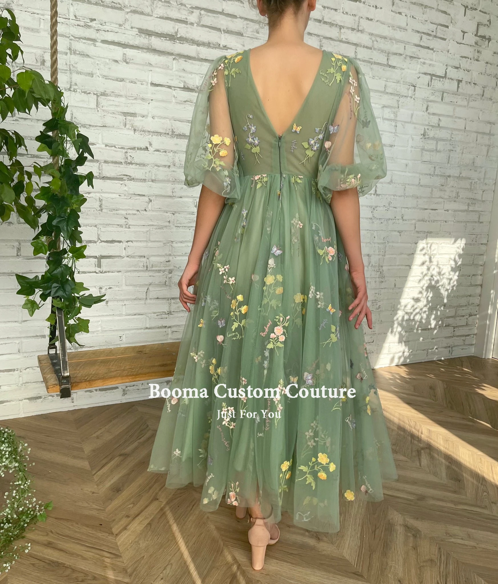 Booma Green Embroidery Lace Midi Prom Dresses Deep V-Neck Half Sleeves Tea-Length Tulle Wedding Party Dresses Formal Gowns 2022
