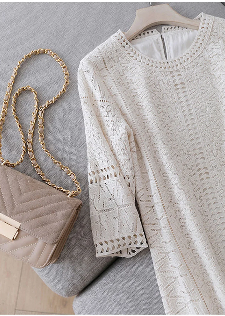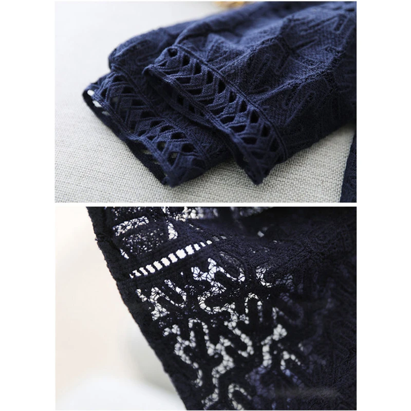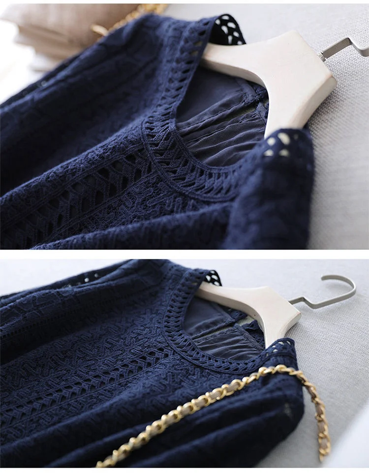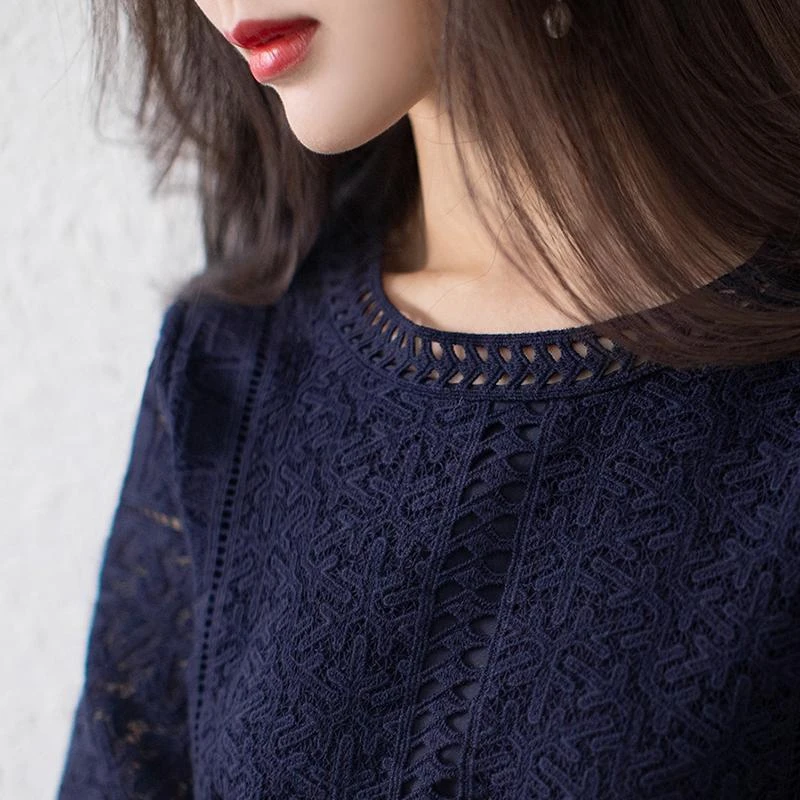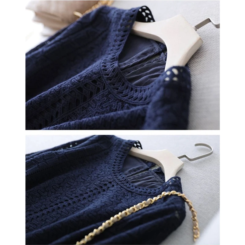 Elegant Blue Dress Lace White Dresses Slim Hollow Out Women Chic Vestidos A-line Skirt Robe Holiday Party Vintage Office Ladies