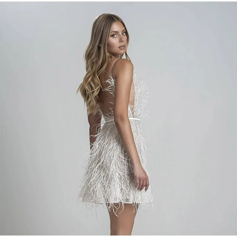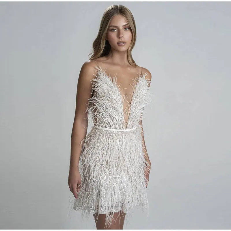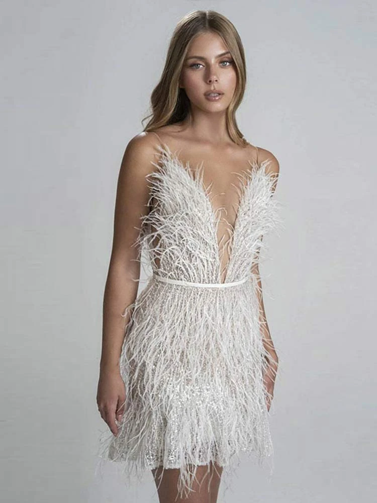 Feather Deep V-Neck Camisole Dress Women Sexy Backless A-Line Solid Mini Dresses Female Spaghetti Strap Fashion Party Clothes