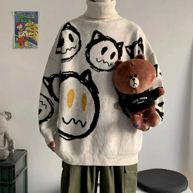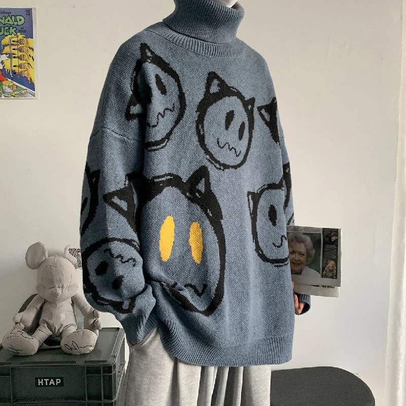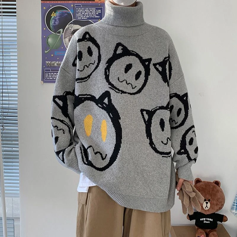 Korean literature art turtleneck sweater men autumn winter lazy style knitted sweater cartoon devil print wool clothes pullovers