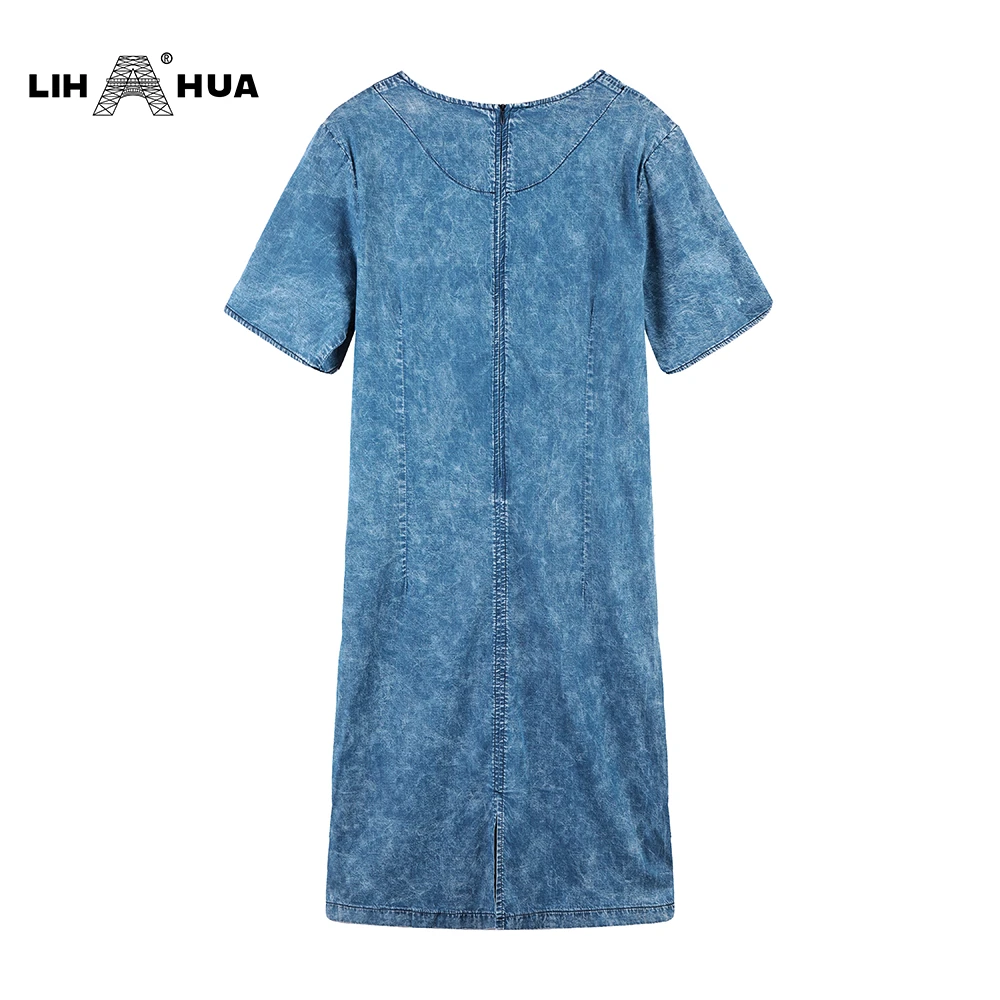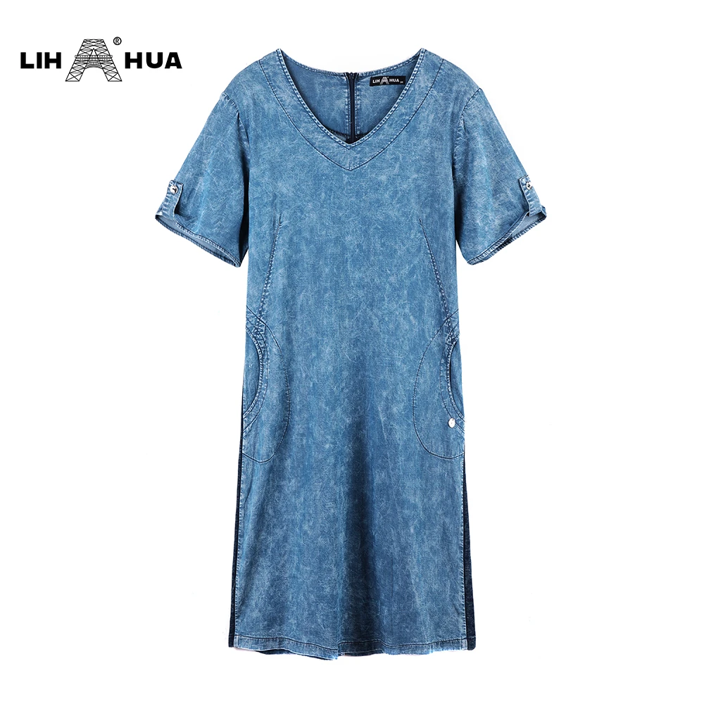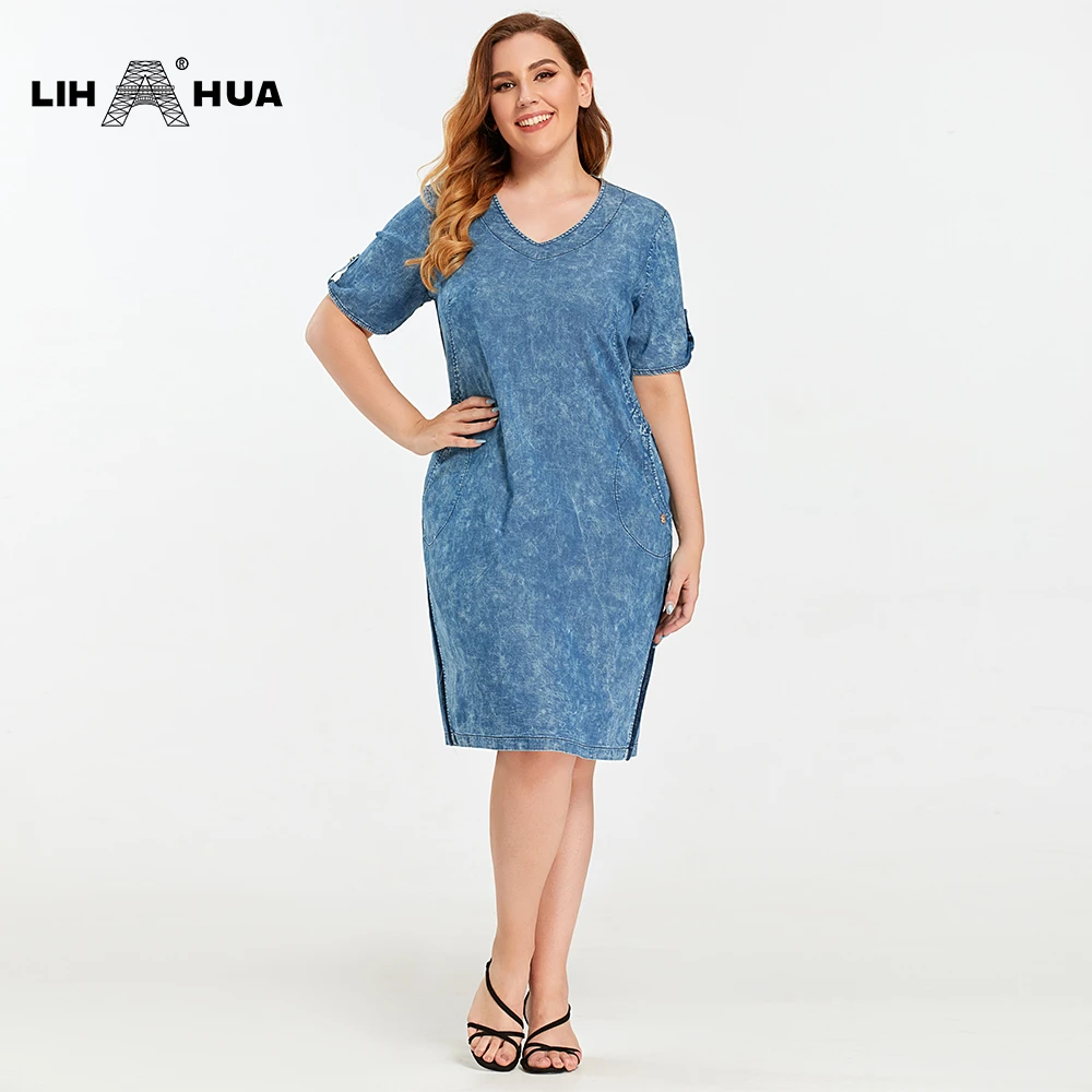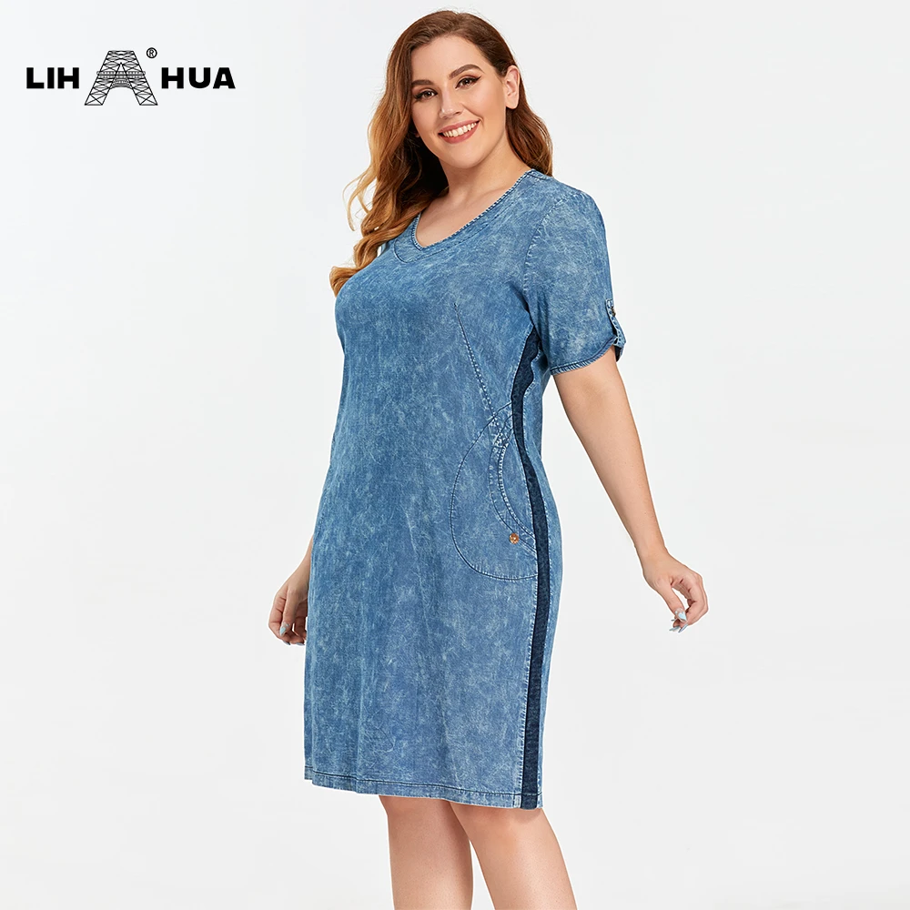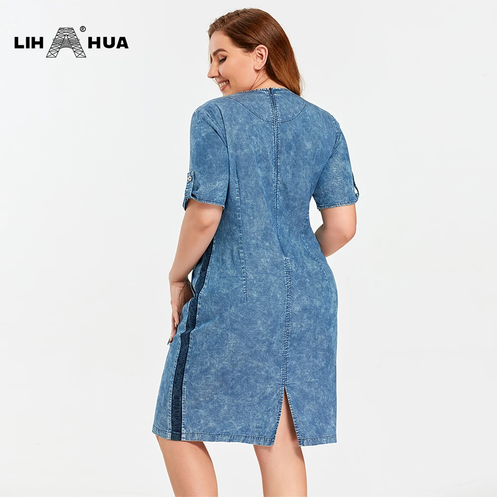LIH HUA Women's Plus Size Denim Dress Summer Slim Dress Casual Dress Cotton Woven Denim Short Sleeves
