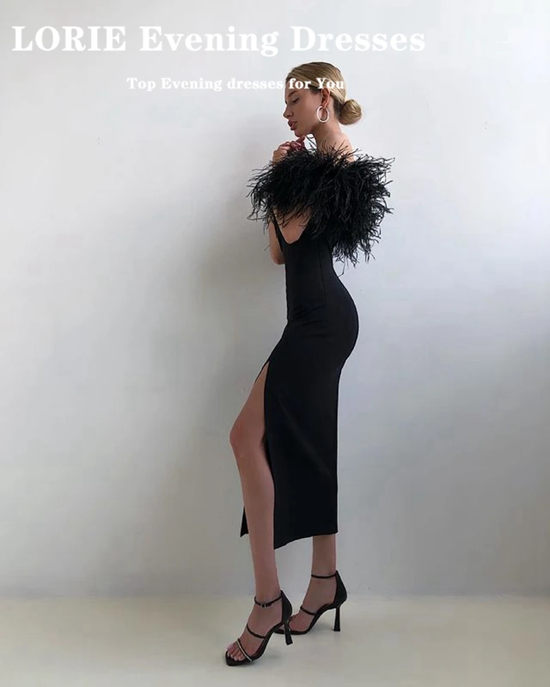 LORIE Straight Four-way Stretch Tea-Length Evening Dresses 2021 Prom Dress With Feather Side Slit Vestidos De Fiesta Party Gowns