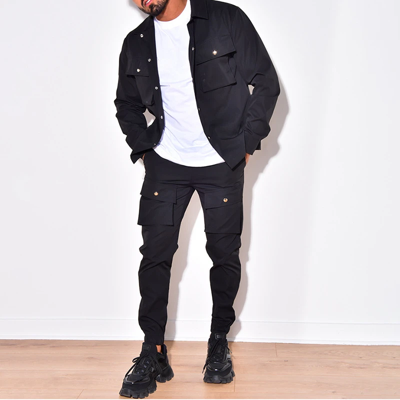 Streetwear Mens Two Piece Sets Autumn Trend Turn-down Collar Jackets And Pockets Cargo Pants Suits Men Fashion Slim Fit Outfits