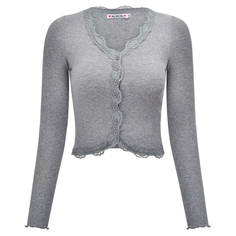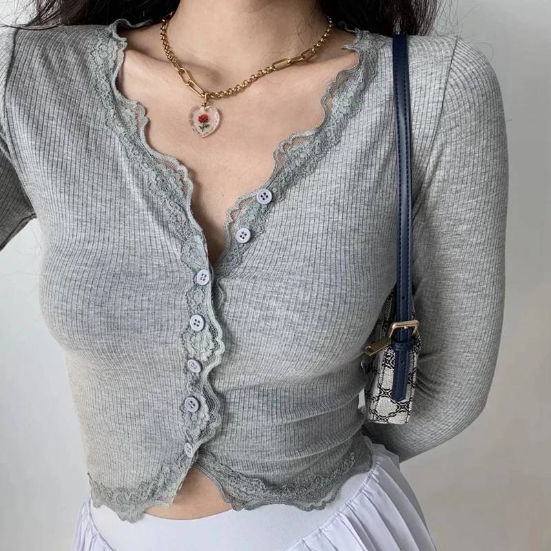V-Neck Lace Patchwork Sexy Crop Top Women T Shirts Knitted Slim Tee Tops Button Grey T-shirt Autumn Thin Long Sleeve Casual