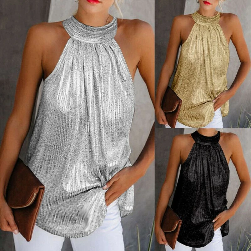 Women Gold Blouse 2021New Fashion High Neck Sleeveless Hatler Tank Top Vest Summer Casual Loose Blouse Shirt Tee